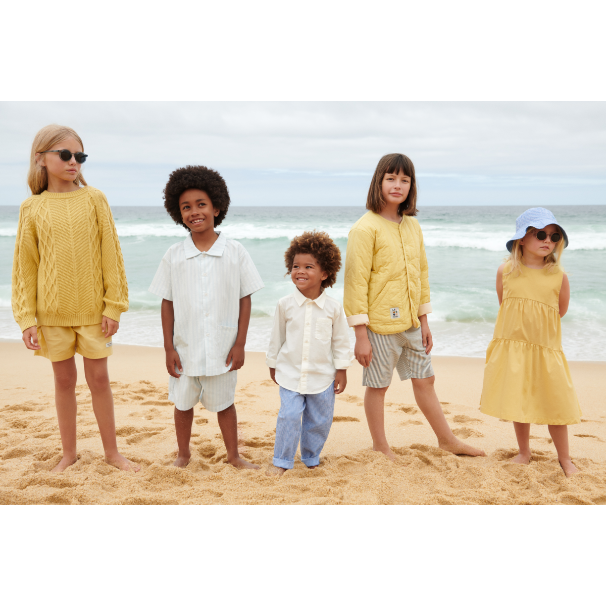 I shorts in twill a righe Barrett sono un capo essenziale per il guardaroba estivo dei più piccoli. Realizzati in un mix di cotone biologico certificato GOTS e spandex, offrono una vestibilità comoda e versatile, perfetta per l’uso quotidiano. Il tessuto tinto in filo garantisce una lunga durata del colore, mentre i dettagli curati come pieghe, tasche e passanti per cintura aggiungono un tocco di stile classico.
