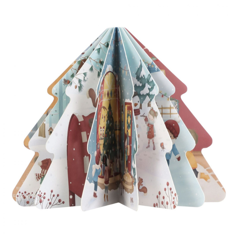 Libro di Natale a Forma di Albero: Un libretto splendidamente illustrato con una speciale copertina magnetica. La sua sagoma unica a forma di albero di Natale gli permette di stare in piedi, trasformandosi in una bellissima decorazione natalizia in cartone.