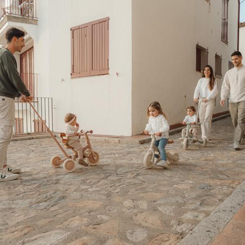 Triciclo a Spinta (da 1 anno): Rimuovendo le sponde, il bambino inizia a spingersi con i piedi (senza pedali), allenando in autonomia i primi rudimenti della motricità.